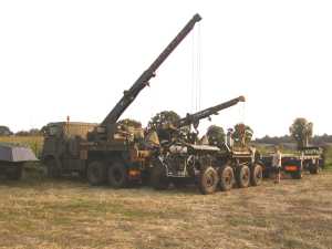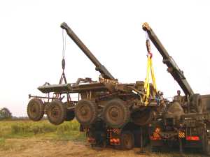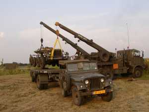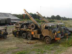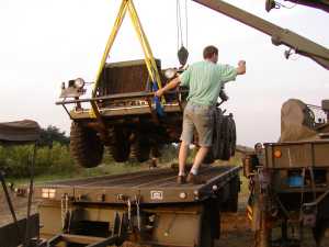 Op donderdag 7 augustus 2003 gingen we de voertuigen klaarzetten en laden. Het meest spectaculaire was het laden van de instructie YP op de aanhangwagen. Hiervoor waren 2 takeldozen en een Nekaf nodig.
