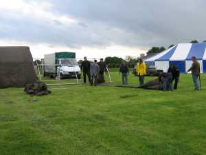 Het opbouwen van ons kamp. Terwijl we bezig waren begon het te regenen en hard te waaien.