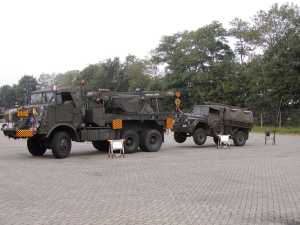 DAF YB-616 takelwagen met DAF YA-126 Lijnwerkersvoertuig in de takels.