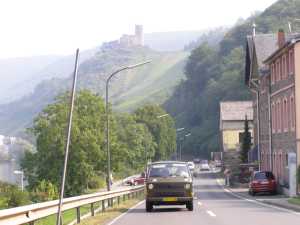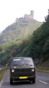 De VW Bus bij vertrek uit Bernkastel-Kues (op de achtergrond het kasteel).